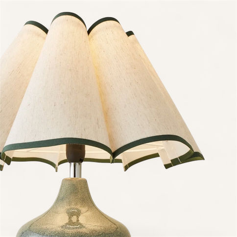 Introduce elegance to your living space or nursery with the Bonnie speckled table lamp. Featuring a ceramic base with a scalloped edge fabric lampshade in a natural finish with a matching green trim.