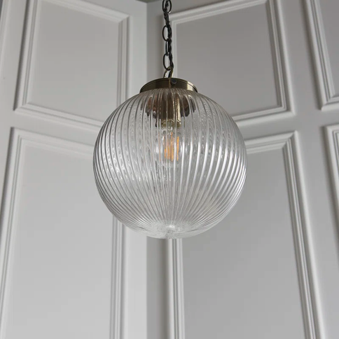 Veneta Pendant Light with ribbed round glass shade hanging from a decorative chain with a vintage-inspired brass finish.